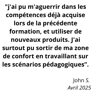 • 100% des stagiaires estiment être en capacité de mettre en oeuvre ce qu’ils ont appris à l’issue de la formation.